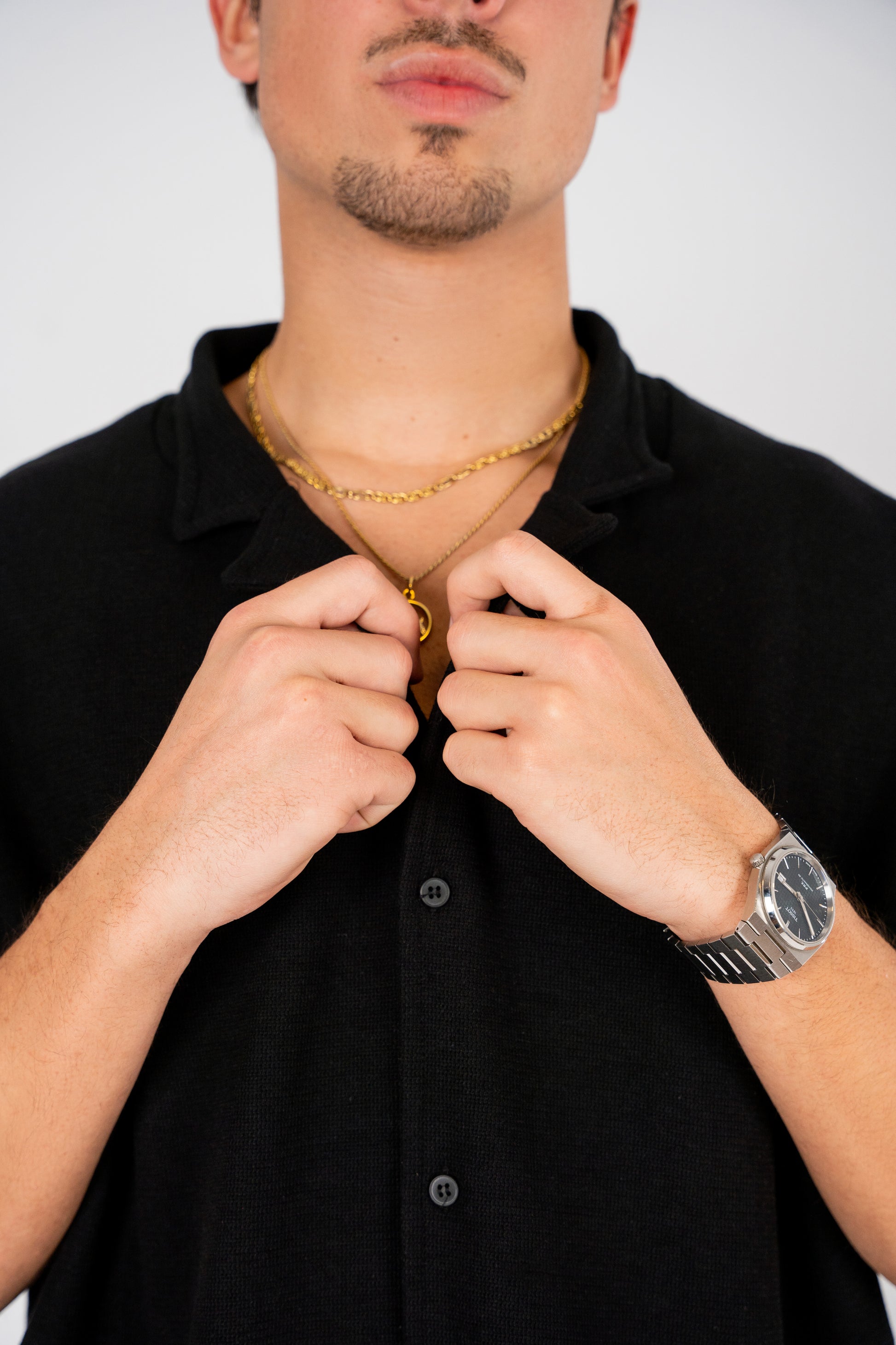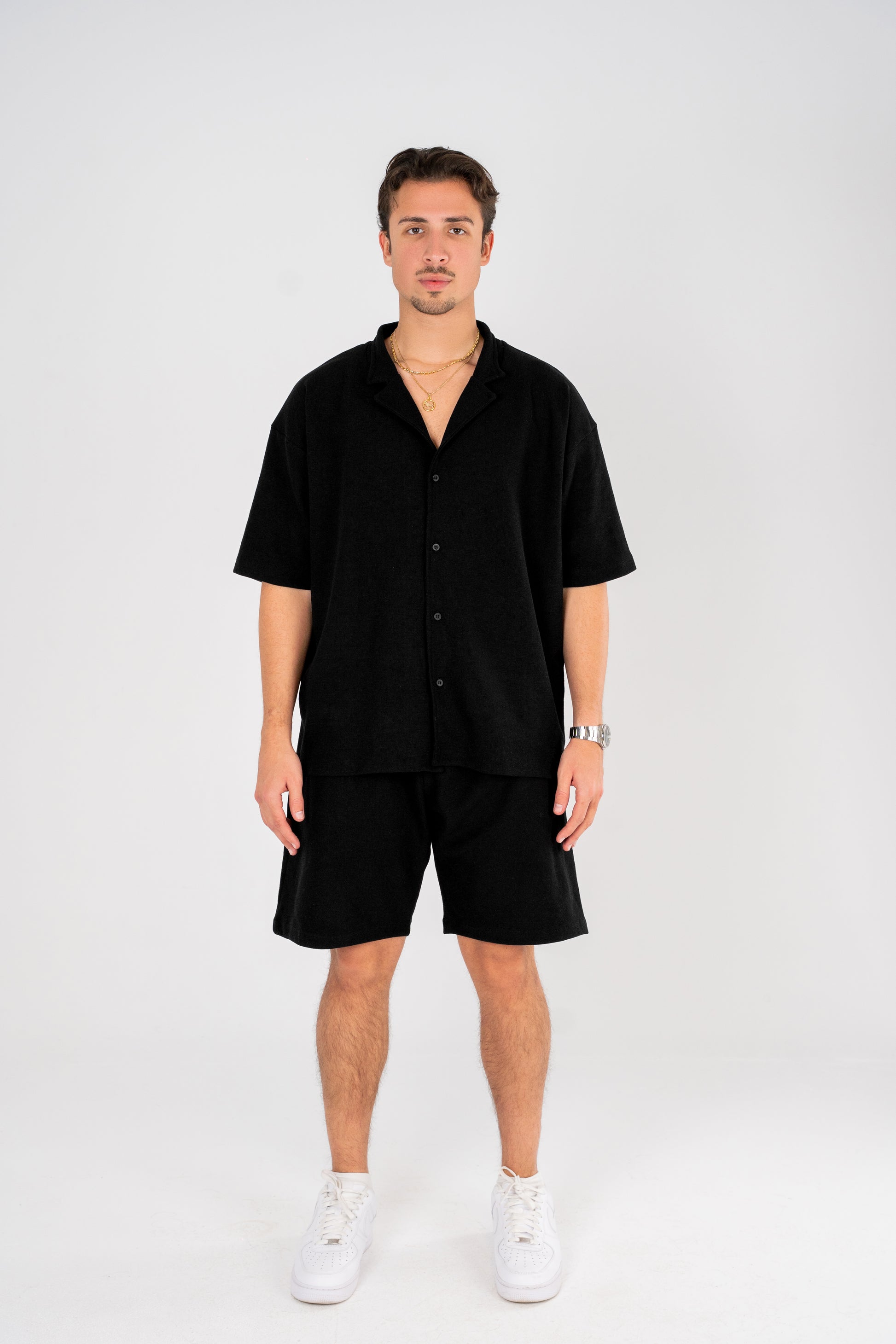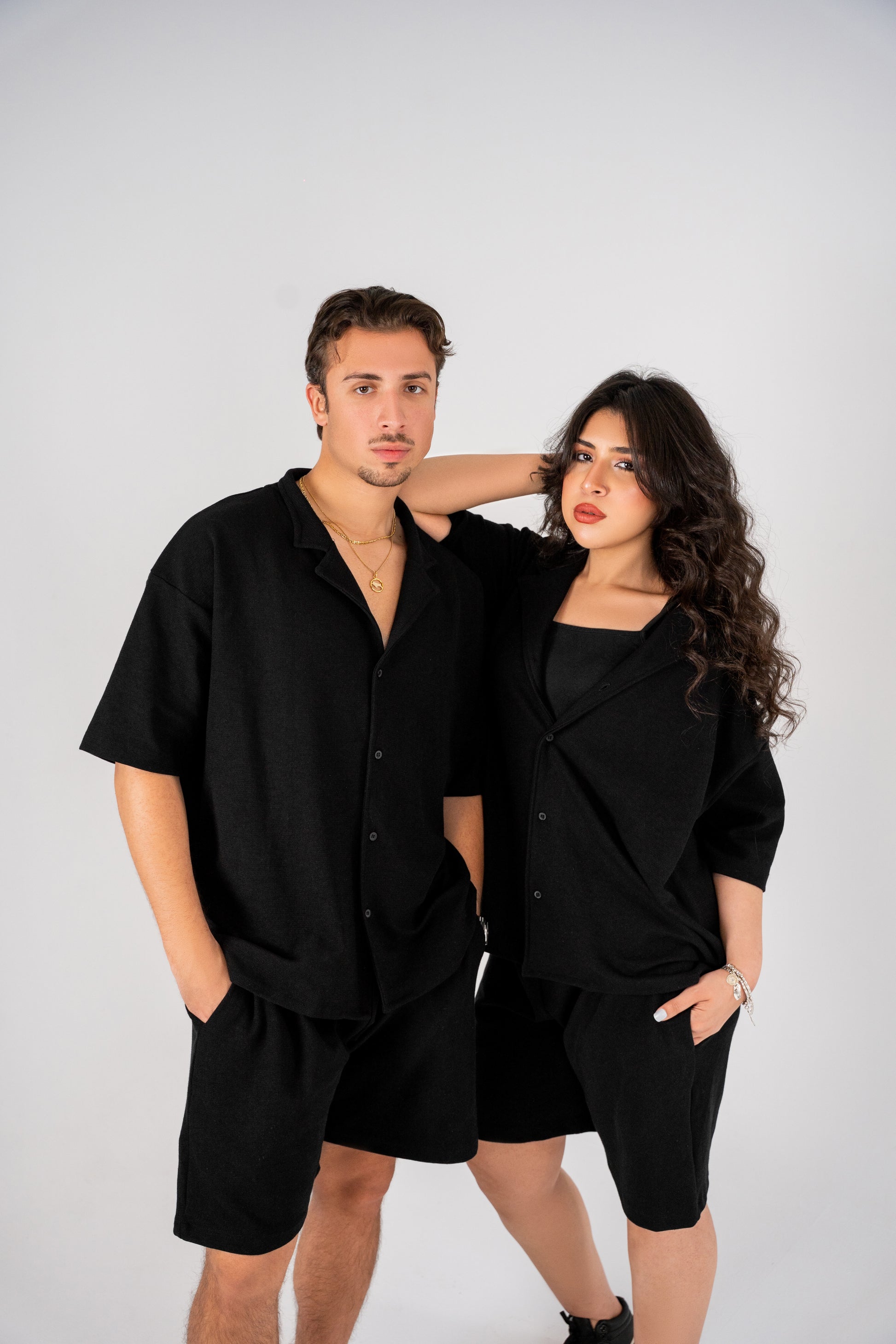 طقم أسود مكوّن من قميص وشورت أوفرسايز، مصمّم بعناية ليناسب الجنسين.